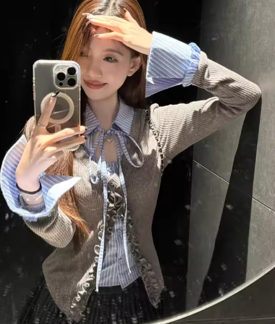 トレンドの青シャツ&グレーカーディガンみたいなドッキングトップスです。