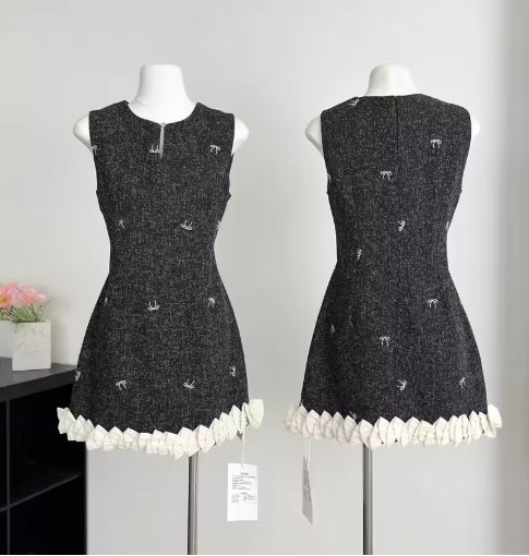 さらっとしたあまり厚くないツイードにリボン刺しゅうで