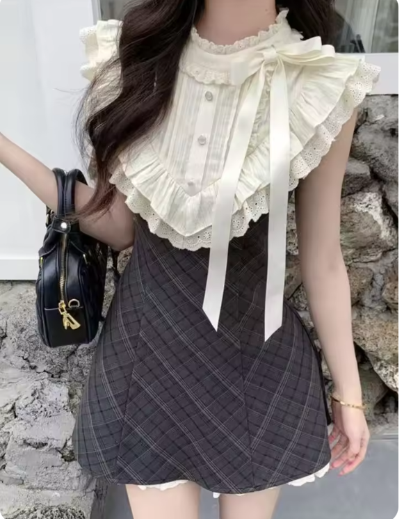 トレンドのチェック柄とフリルやリボンがかわいいミニワンピースです。