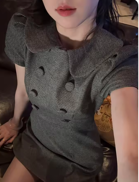 ダブルのクルミボタンや丸い襟がフェミニンでかわいい。