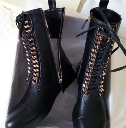キューバチェーンの飾りが目を引く編み上げブーツです。