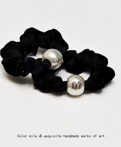 mデザインのコロンとしたパールがかわいいシュシュです。