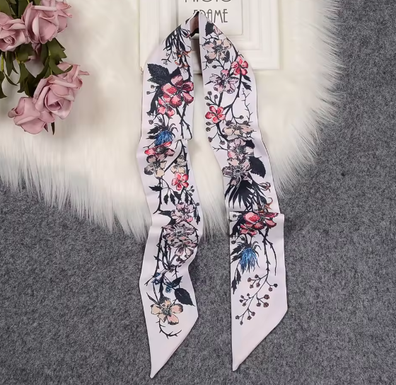 こちらも繊細なプリントが美しい細長いスカーフです。
