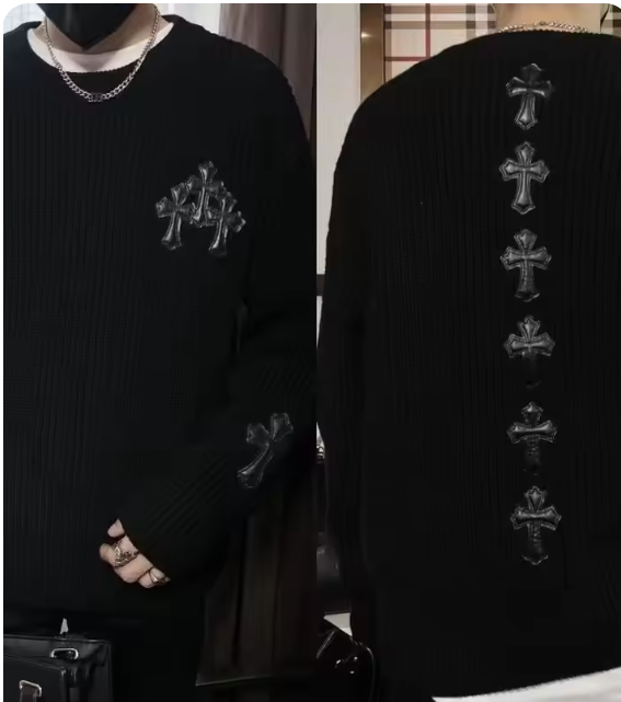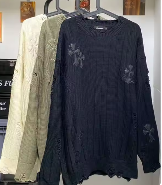クロスパッチがついたダメージ加工入りのニットです。