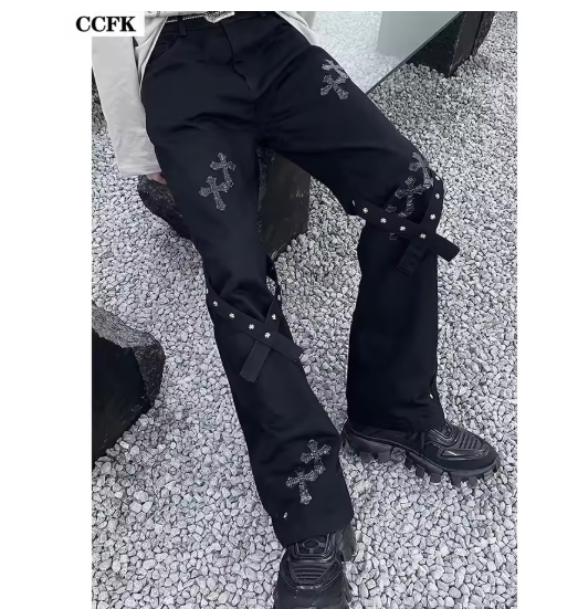 クロスパッチに、膝のベルトデザインがパンクな印象のボトムスです。