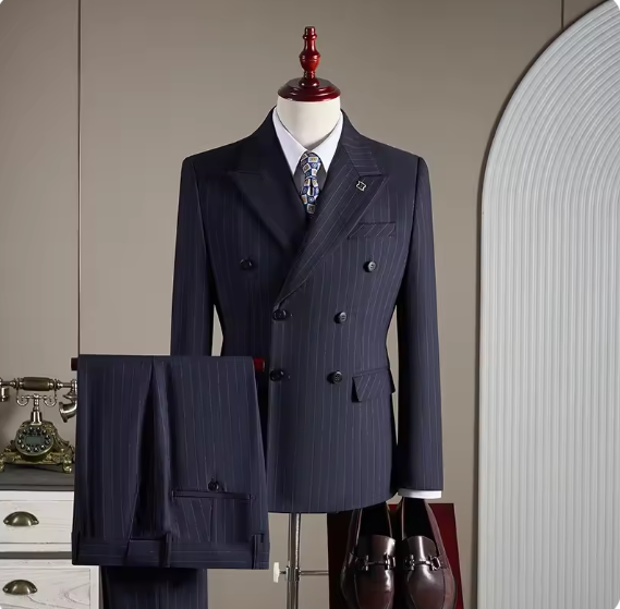 こちらは一転してフォーマル感の強いダブルブレストのスーツ、3点セットです。