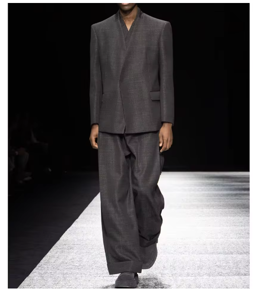 こちらはグッとモードな雰囲気のノーカラースーツ。
