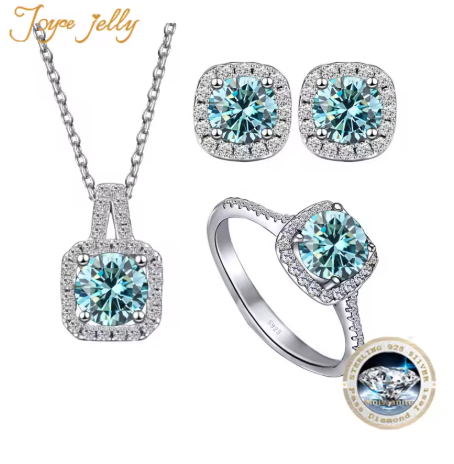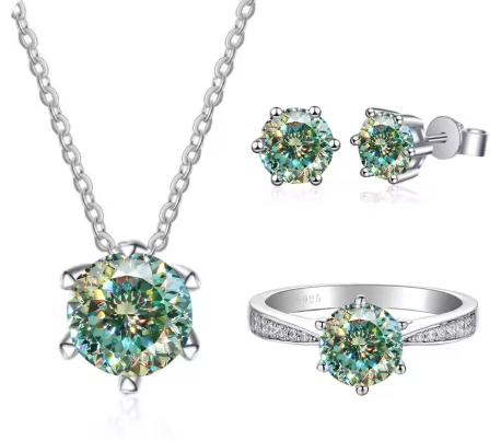 カラーモアッサナイトのネックレス、リング、ピアスの3点セットです。