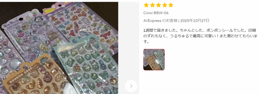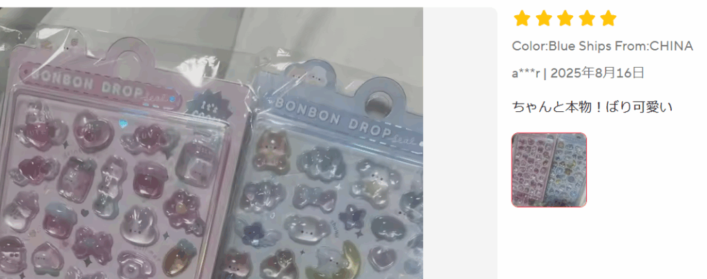 猫とくろみとまいめろを2ヶ月くらい前に購入しましたが、びっくりするほどの偽物感でしたw本物は300倍綺麗です✨しかもアリエクのはすぐ剥がれ落ちてしまいました。。美しさを求める方は日本でお求めになることをお勧めします。参考までに。