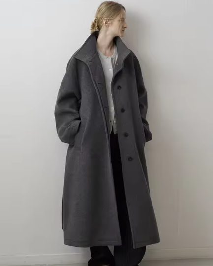 キリっとしたスタンドカラーのガウン風の大人のコートです。