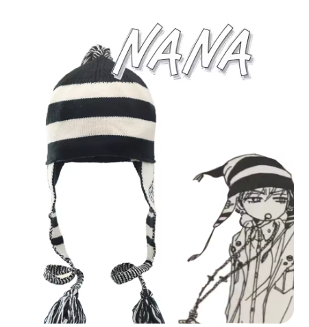 耳のところに土星が編み込まれたボーダーニット帽です。