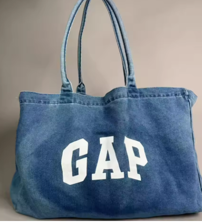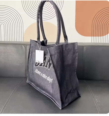 デニム風のスクエアトートに刺繍が入っています。