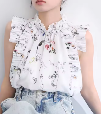 代わりにと言っては何ですが、ボタニカル柄のプリーツブラウスとかいかがですか。
