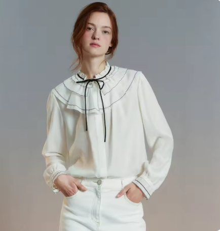 まずはスタンドカラーやリボン風なボウタイがクラシックなブラウス。