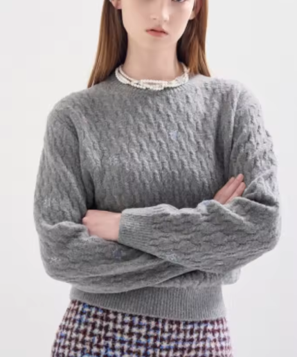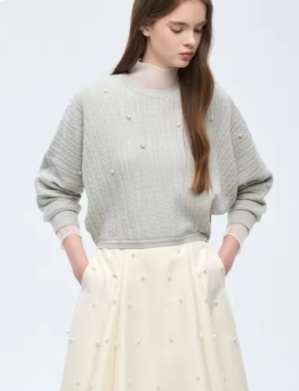パール付きの細ケーブル編みニットです。