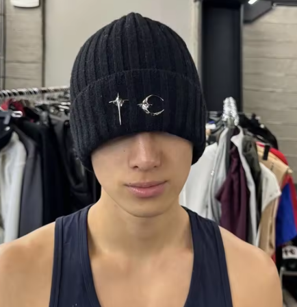 韓国風なシルバーチャームが付いたニット帽です。