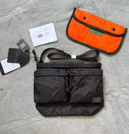 FORCEシリーズ風のショルダーバッグで、マチが薄く体に沿う持ちやすい設計。