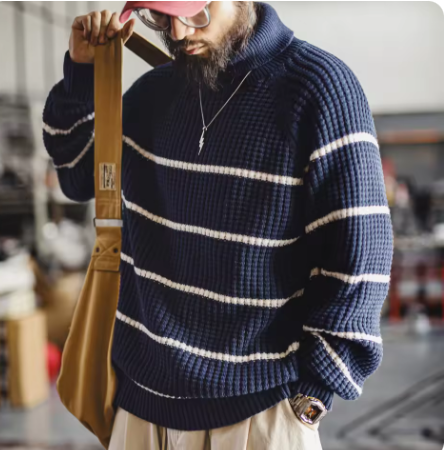 ネイビー×ホワイトの定番配色で、春・秋・冬と長く使える一着です。