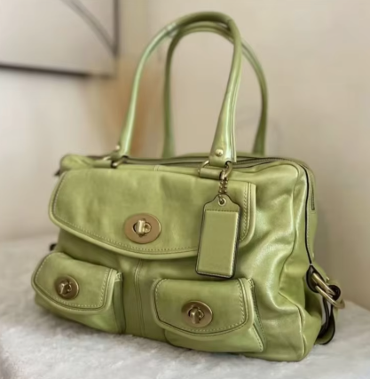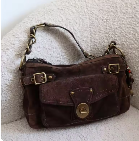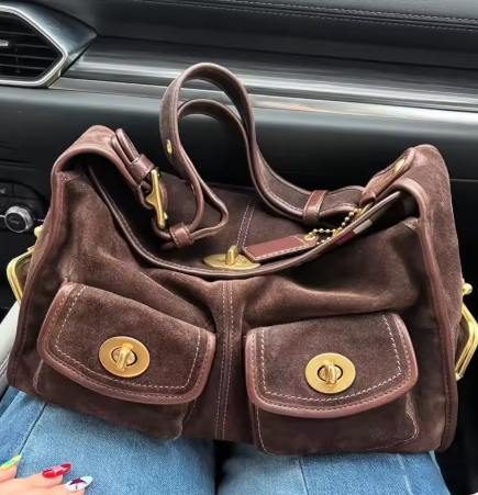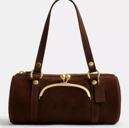 ターンロック金具が特徴的なスウェードバッグです。