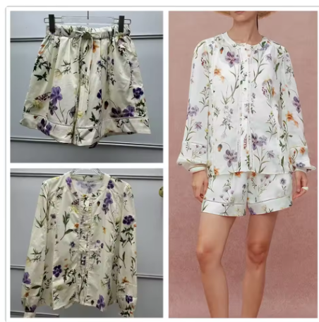 大人なボタニカル型のブラウスとショートパンツです。