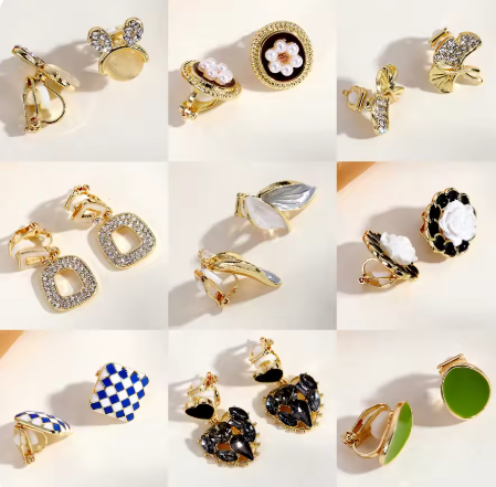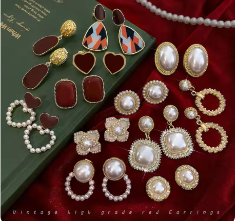 こちらはクラシカルなパールや深紅のエナメル風のイヤリングいろいろ。