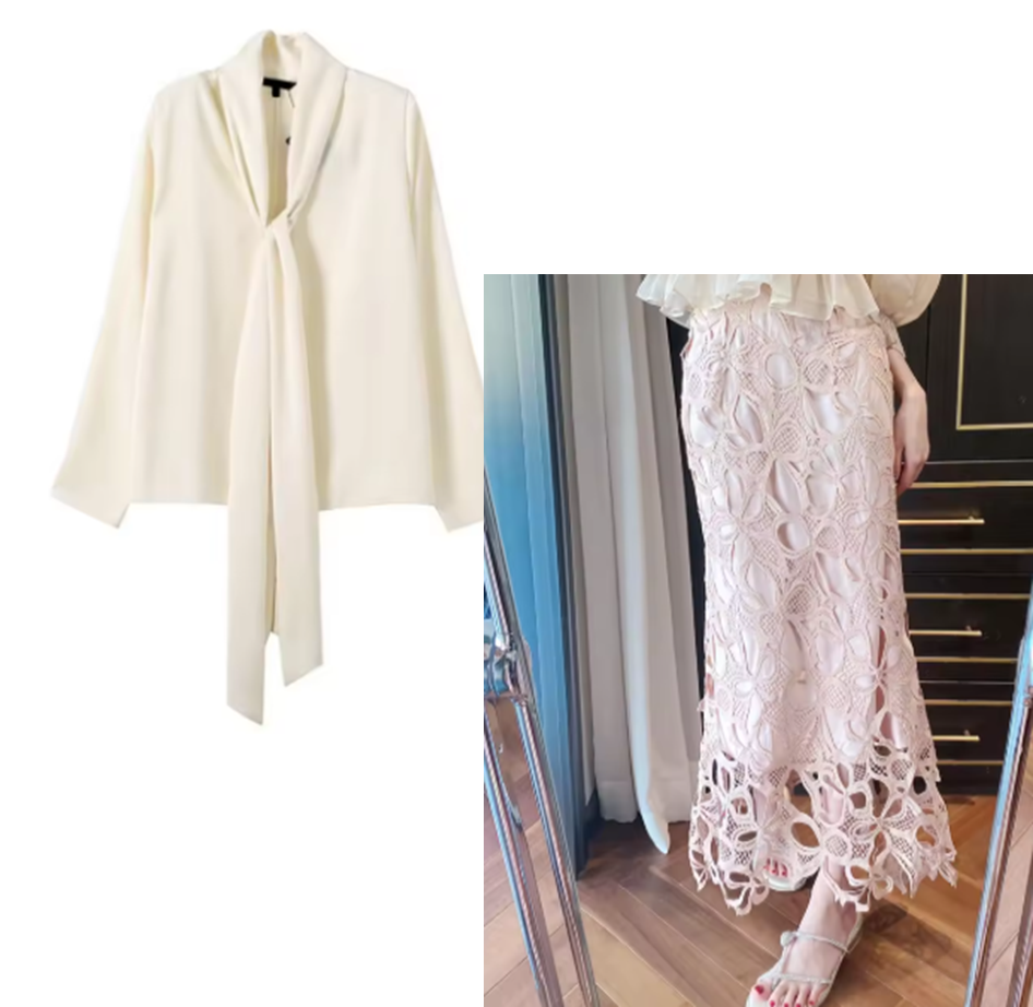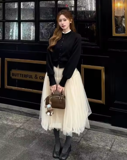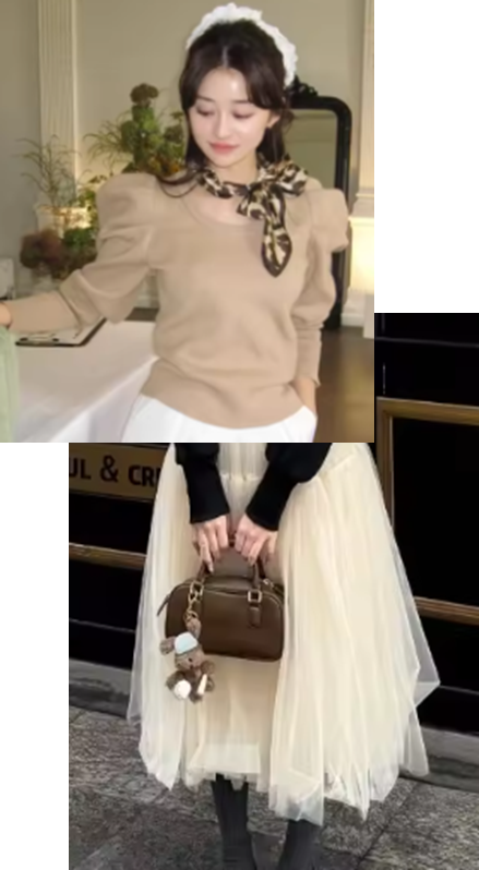 チュールレーススカートに、日本風なニットを合わせた例です。