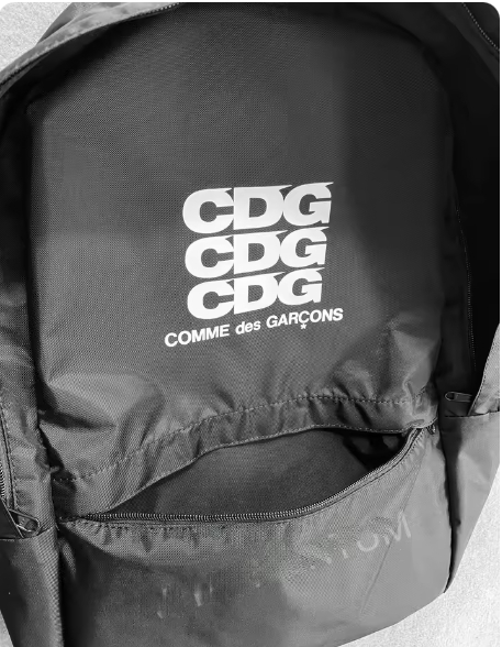 CDG風なプリントが入った黒のベーシックなバックパックです。